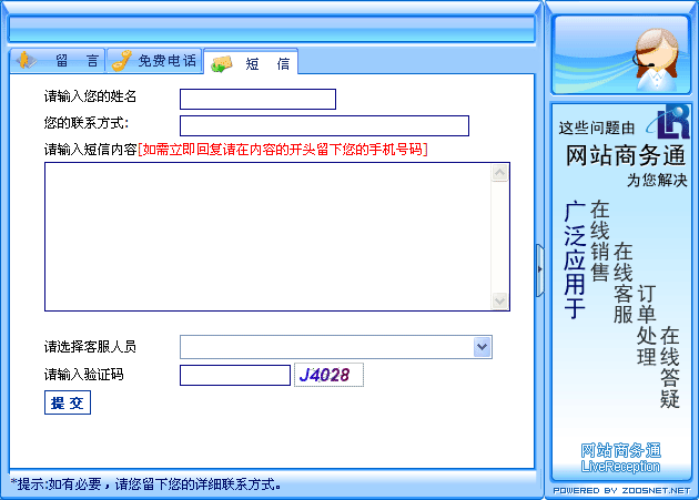 - 网站商务通短信功能说明1、当您的客服人员不在线时,访客可以通过网页里的对话窗口,点短信留言,把想发送的信息传到您客服人员指定的手机上,可以多个客服人员分别使用。